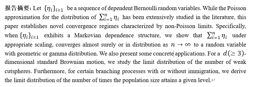 学术报告:Limit distribution for sums of inhomogeneous Markovian Bernoulli variables
